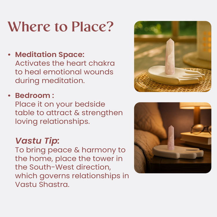 The Rose Quartz Tower is a potent healing crystal in Vedic astrology, revered as the Stone of Unconditional Love. Guided by Venus, this Heart Chakra crystal radiates love, compassion, and emotional healing. A must-have for couples wanting to deepen their bond and for anyone healing from a breakup. This Rose Quartz Tower fills your space with love and peace, ideal for family harmony or for healers spreading positivity.