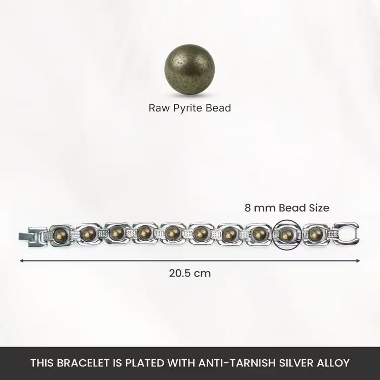 The Silver Metal Raw Pyrite Bracelet is made with natural raw pyrite stones set in a silver-plated bracelet with an anti-tarnish finish. Raw pyrite is known for protecting against buri nazar and bringing positive energy.