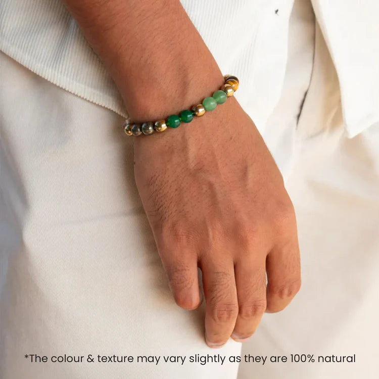 The Adjustable Dhan Yog Bracelet is made with powerful crystals—Citrine, Quartz, Tiger Eye, Green Aventurine, Pyrite, and Hematite. Each stone in this bracelet has its own unique power. Citrine is known for attracting money and success. Quartz gives peace and clears the mind. Tiger Eye boosts courage and helps you make smart decisions. Green Aventurine brings good luck and supports growth in life.