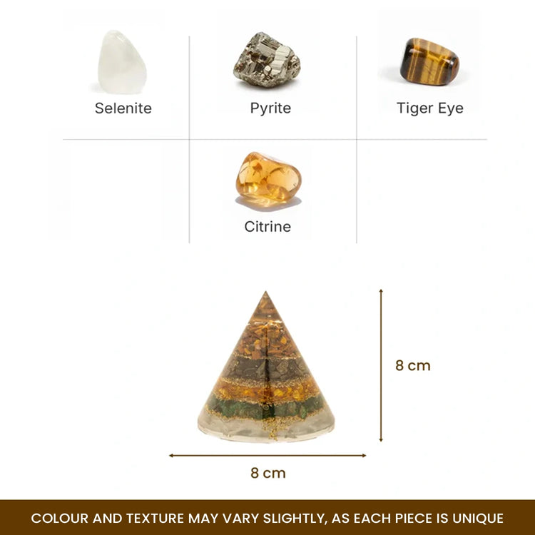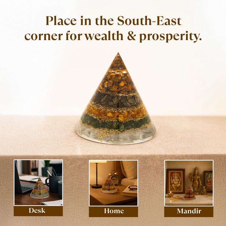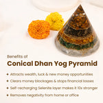 The Conical Dhan Yog Pyramid is a powerful, self-recharging crystal pyramid that attracts money and boosts positivity. With five energised crystals and a natural Selenite crystal layer inside, it recharges the pyramid automatically, making its energy 10x more powerful and active at all times.