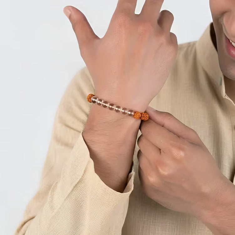 A spiritually empowering 5 Mukhi Rudraksh and White Crystal Bracelet, designed to infuse any outfit with a touch of divine energy and clarity. Replace ordinary accessories with this piece that combines spiritual benefits with modern elegance.